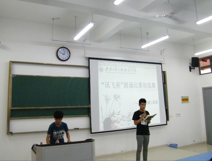 6月12日中午12点40分,我系在新芜校区博雅楼A1N102成功举办了“机械工程系新生朗诵比赛”暨第十届“讯飞杯”全省大学生诗文朗诵比赛系内选拔赛。系学工秘书吴晓、信息工程系辅导员王晓林、系辅导员邓辰,左倩倩应邀担任本次比赛评委。
