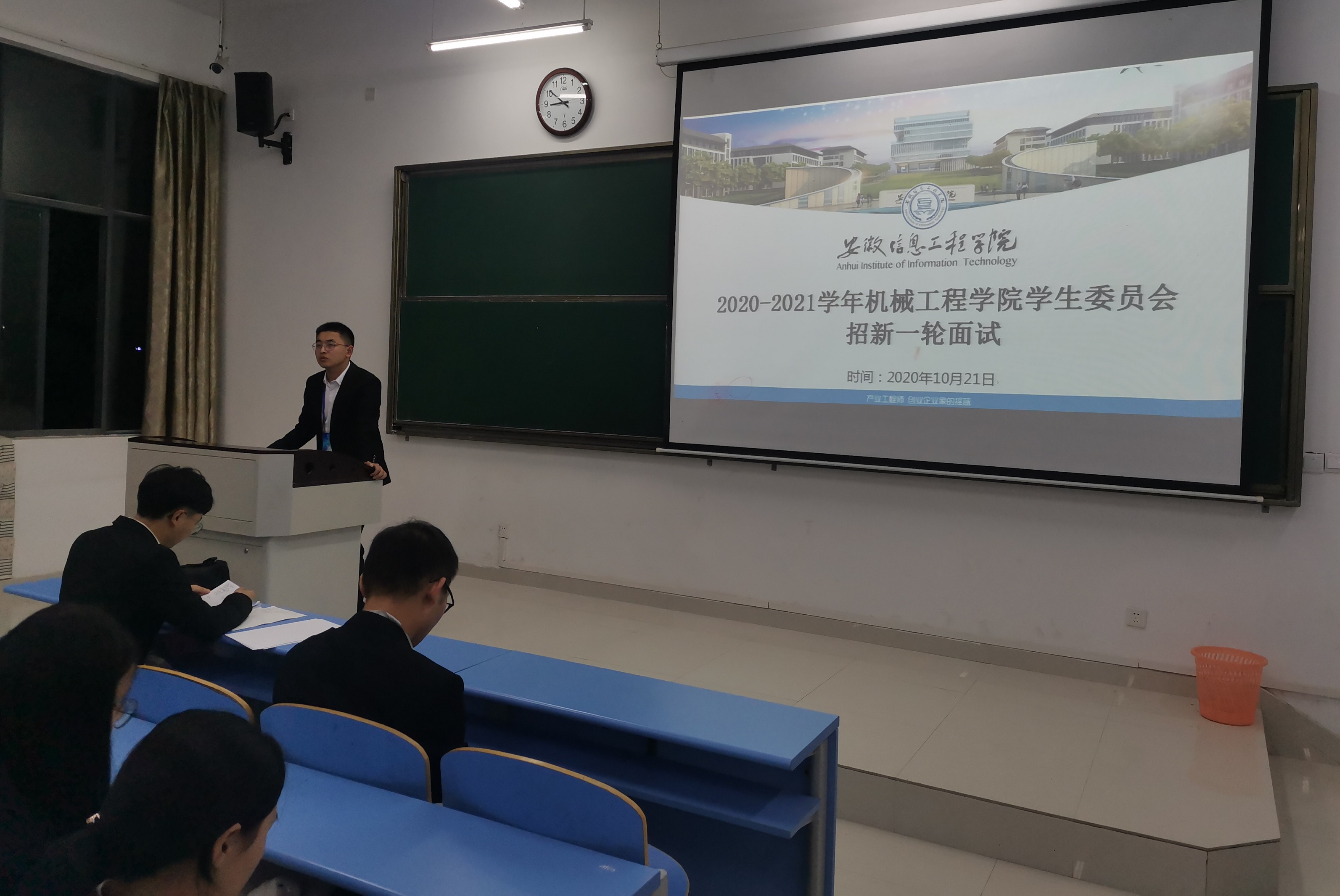 本网讯 为了给同学们提供锻炼能力的平台,为学生会注入新鲜血液,2020年10月21日21点,机械工程学院学生委员会在A1N202开展招新面试。机械工程学院学工秘书韩海东、团总支书记张梦蝶出席本次活动。